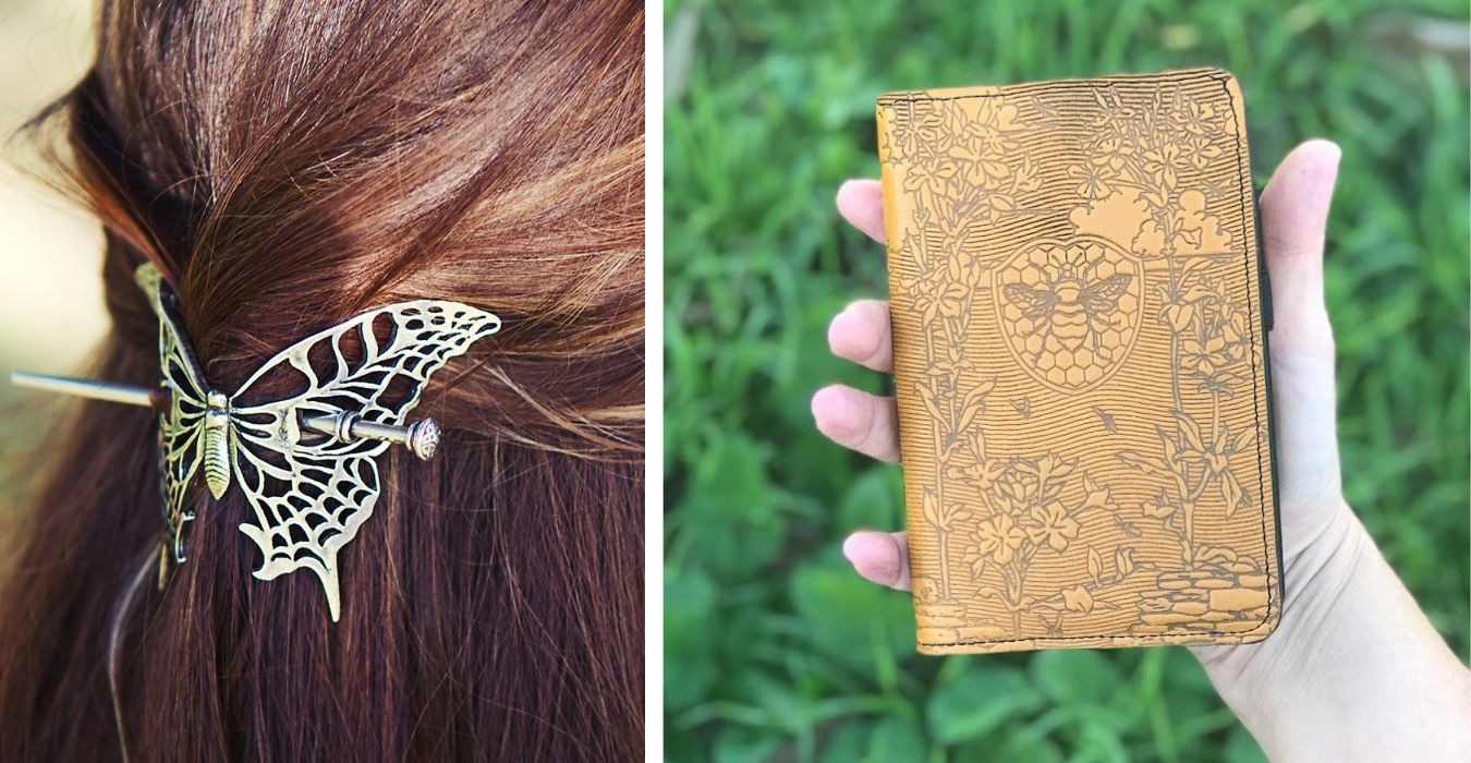 A collection of leather and Britannia metal accessories for Garden Lovers. Hand made in the USA. Flowers, sunshine, bees and butterflies; these garden inspired image designs are sure to inspire you.