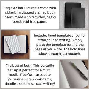 • Book Insert included: blank, hardbound, unlined, made with recycled, heavy bond, acid free paper with a lined template sheet for straight lined writing. Simply place the template behind the page as you write. The bold lines show through just enough.
