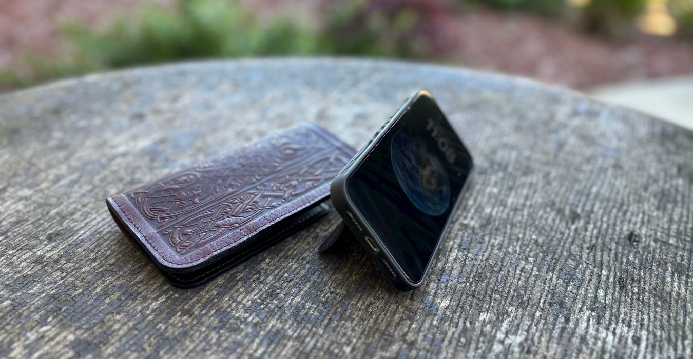 Our innovative hand crafted leather iPhone wallet keeps your device safe and secure utilizing a "case within a case" system. A leather flap on back of the bumper case slides into the pocket to attach case to the wallet, can be used as a kickstand. Interior pockets for cards and cash.